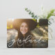 A playful but simple script graduate sits at the bottom of a horizontal photo. The custom text includes room for the graduate's name and also school and year details. The neutral grey backer has a simple grid pattern, and the colour can be changed by clicking "customise further." Announce your graduate's accomplishment to friends and family with this design!