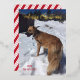 A modern script gold foil Holiday card with your pet's favourite photo . Customise it with your own Christmas greeting and your family name . The back is a classic candy cane stripe pattern .