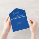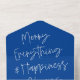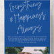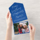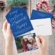 This fun holiday photo card design features a bright blue background with white modern calligraphy script greeting and one horizontal photo. The greeting says "Merry Everything & Happiness Always". On the outside of the card is your return address and another personalised greeting. When the photo is torn away as a keepsake the recipient will also have your greeting on the back of the photo portion. As you can see there is need to order envelopes!!