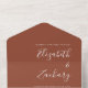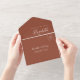 This simple modern all-in-one wedding invitation features white text on a deep terracotta burnt orange background. Add the names of the bride and groom in stylish handwriting calligraphy and the details in sans serif font. Add your return address in white on the exterior flap and back of the detachable RSVP.