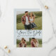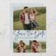 With a three photos and a modern script written "save the date" in black on a light blue background, this card is the perfect way to announce your engagement and upcoming wedding to friends and family. The black text is bold and modern but still sophisticated. The customisable text on the front has room for names, date, location and other information like a wedding website. The back is a matching sky blue with a white starry speckle. The colour can be changed by clicking "customise further."