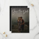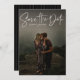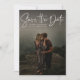 With a single vertical photo and a modern script written "save the date," this card is the perfect way to announce your engagement and upcoming wedding to friends and family. The white text is bold and modern but still sophisticated. The customisable text on the front has room for names, date, location and other information like a wedding website. The back is a black and white striped pattern. The black colour is editable by clicking "Customise."