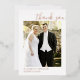 Simple, modern double sided wedding thank you card. The front features a wedding photo with thank you in a real rose gold foil handwritten typography. Personalise with the couples name and wedding date in rose gold foil. The flip side features another photo with the couples personal message of thanks and their signature