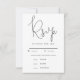 Modern and simple wedding RSVP card featuring a hand written script that says "Rsvp" in black and white. This response card also lists the entree selection for guests to choose from. This minimalistic design works for any season!