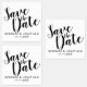 featuring title "Save the Date" in black modern script font with name and date in modern sans serif font on white background.