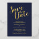This design title "Save the Date" in real gold foil modern script font with wedding details in real gold foil modern sans serif font on navy blue background.