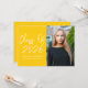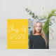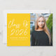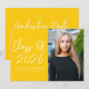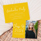 Modern graduation party invites featuring "Class of 2025" in a white handwritten script on a yellow background. Personalise the front of the graduation invite by adding the graduate's name, school name, and vertical photo. The invite reverses to display your graduation party details in white lettering on a yellow background.