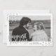 Stylish holiday photo card featuring the words "Happiest Holidays" in a faux silver foil script font, painted dots, placeholders for custom photo and text, and a black watercolor design on the back.