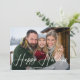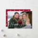 Modern holiday photo card featuring "Happy Holidays" displayed in a white handwritten script overlaying your horizontal photo. Personalise the front of the holiday photo card with your family name and the year. The card reverses to a red and white snowflake pattern.