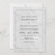 These elegant wedding invitations feature a white marble look background, with a minimal faux silver frame and black text.
