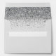 The inside of this elegant modern wedding invitation envelope features a silver faux glitter design on a pale grey background. Customise the back flap with the names of the bride and groom in charcoal grey handwriting script and return address in copperplate font on a pale grey background.