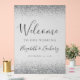 The top and bottom borders of this elegant sign are decorated with silver faux glitter. Customise the text in charcoal grey handwriting script and serif fonts on a pale grey background.