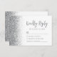 The left-hand edge of this elegant modern wedding RSVP enclosure card features a silver faux glitter border. The customisable text combines grey handwriting script and sans serif font on a white background. The reverse side features a matching white and silver design.