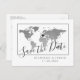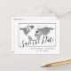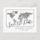 Silver world map save the date postcard with a modern and minimalist design, plus a heart marker you can move to mark your destination wedding location or travel theme inspiration location.