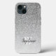Add a glam touch to your phone with this chic phone case, featuring a background pattern of silver ombre faux glitter. Personalise it with her initial in white serif font and her name in charcoal grey handwriting-style brush script.