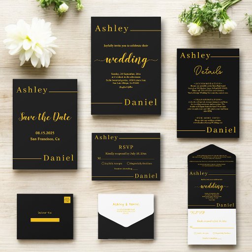 Modern Simple Black And Gold Elegant Chic Wedding All In One Invitation