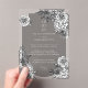 A classic black and white invitation on this modern acrylic card. Delicate hand-drawn peonies adorn the corners, adding a touch of floral elegance without the use of colour. This modern, monochrome design creates an edgy yet timeless look that pairs effortlessly with any décor. A semi-transparent Art Deco–inspired frame highlights the text, ensuring it stands out beautifully on this transparent invitation.