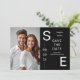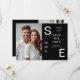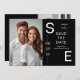 This elegant, minimalist, simple, QR code, 2 photos wedding Save the Date card features black background with modern white calligraphy and initials, monogram.