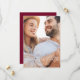 Wedding save the date photo double-sided card with full bleed photo, This design features a modern burgundy simple photo elegant, calligraphy script traditional modern, chic script stylish classic wine, simple minimalist typography marsala, elegant modern calligraphy trendy, autumn summer winter spring fall, classy one couples photo engaged, a vertical one couples photo picture, with a full bleed photo layout template, a simplistic contemporary elegance style
