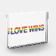 Modern, colourful, vibrant typographic graphic design of saying "Love Wins" in rainbow flag colours. Simple, bold, vibrant and urban graphic art.