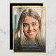 This is a modern and elegant high school graduation announcement in real gold pressed foil using a simple but classic font along with a single minimalistic photo on the front with an elegant gold frame border. The reverse side includes a message that you can personalise, along with another photo. Please contact the designer for any queries related to this design.