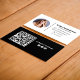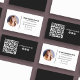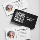This design features a simple business card template with a modern professional simple minimalist look, minimal elegant social media icons, trendy plain scannable QR code, a chic digital contact photo picture, a phone email cell website icon, a simple black and white, elegantly minimalist design stylish, photo or graphic template, contemporary clean modern style, add your own logo or photo picture