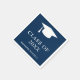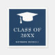 Modern graduation napkin featuring a simple and masculine design with "Class of Year" in large bold typography along with a grad cap and the graduate's name in white over a navy blue background. These napkins are perfect for a guy graduate and are a great way to add a personal touch to your graduation party.