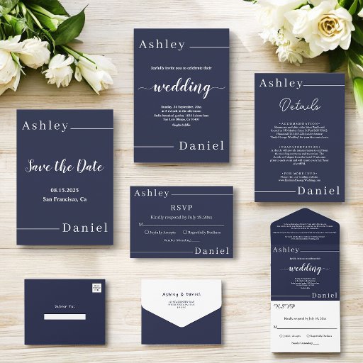 Modern Simple Navy Blue White Formal Chic Wedding All In One Invitation