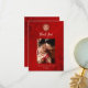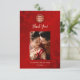 This Chinese wedding thank you card features a gold double happiness sign and "thank you" words in an modern handwritten script on a red shimmering background. With a custom wedding thank you text, your photo and your names and wedding date.