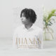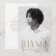 Simple graduation thank you card featuring the graduate's vertical photo with "Thanks" displayed in brass/antique gold, modern art deco lettering. Personalise the front of the photo graduation thank you card by adding the graduate's name, school name, and graduation year. The card reverses to display your custom thank you message in gold lettering or leave the back blank to handwrite your own!
