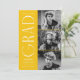Stylish graduation announcement featuring the graduate's three photos located to the right of the design in a vertical layout. "Grad" is displayed in white, modern art deco lettering with a yellow background. Personalise the modern photo graduation announcement by adding the graduate's name, graduation year, and school name. The design reverses to display a yellow and white geometric swirl background. Perfect for both high school and college graduations!