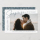 Modern Slate Blue Script Surprise Photo Engagement Announcement