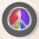 Modern Sleek Metallic Peace Sign coaster. Colorful Modern Red, blue, yellow, and purple metallic peace sign on top of black metallic pattern background.