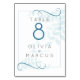 Wedding Table Number | Chic and simple, pale blue foliage behind the text with a thin frame and swirls in smokey blue teal to accent - This is part of a coordinated wedding suite.