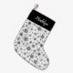 Modern chic black and white stocking features a snowflake pattern with your name or monogram at the top in white calligraphy script lettering.