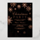 A modern winter Holiday Christmas real rose gold foil snowflakes illustration on editable black background, with pine tree branches on black background with an elegant script typography.