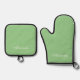 Modern Solid Sage Green coloured Simple template Oven Mitt & Pot Holder Set. A Modern kitchen oven mitt featuring an easy-to-personalise template, for the perfect custom kitchen.