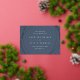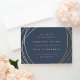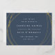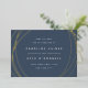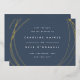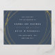 Announce your wedding date and location in chic modern style with these sleek save the date cards featuring abstract yet geometric detailing on a smoky navy blue background. Front features your wedding details in minimalist modern lettering, encircled by irregular sphere shapes in elegant gold. Add additional details, like your wedding website, to the back.
