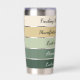 This tumbler design features a clean, vintage Saint Patrick’s Day palette arranged in smooth horizontal bands—from emerald at the base up to soft cream at the top. The colors create a fresh, trendy look: a dark green foundation, layered with medium and bright vintage shamrock greens, accented by a warm golden stripe, and finished with a soft, glowing cream tone. The palette feels uplifting, stylish, and lightly festive—perfect for a chic St. Patrick’s aesthetic. Up to 5 phrases can be placed on the tumbler in a sleek, minimal, modern typeface for a fresh and trendy look.