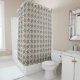 Giant overlapping stars form a Mid-Century Modern geometric tiled pattern shower curtain - charcoal grey / grey stars with a taupe tan background and a crisp, white outline