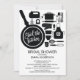 Stylish Black & white stock the kitchen wedding shower invitation featuring kitchen tools including a frying pan, hand mixer, kitchen timer, pot, utensils, apron, whisk, measuring cup, pot holder & cups. Visit our shop to view this kitchen shower invite in other colours.