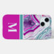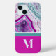 Stylish Modern Teal Magenta Stone Initial Monogram iPhone 15 Case. Crystals and geodes continue to be a favourite trend! This print features and up close image of a vibrant turquoise and purple (magenta) geode stone, complete with little crystals. Add your initial to make it your own. A fun and girly every day case.