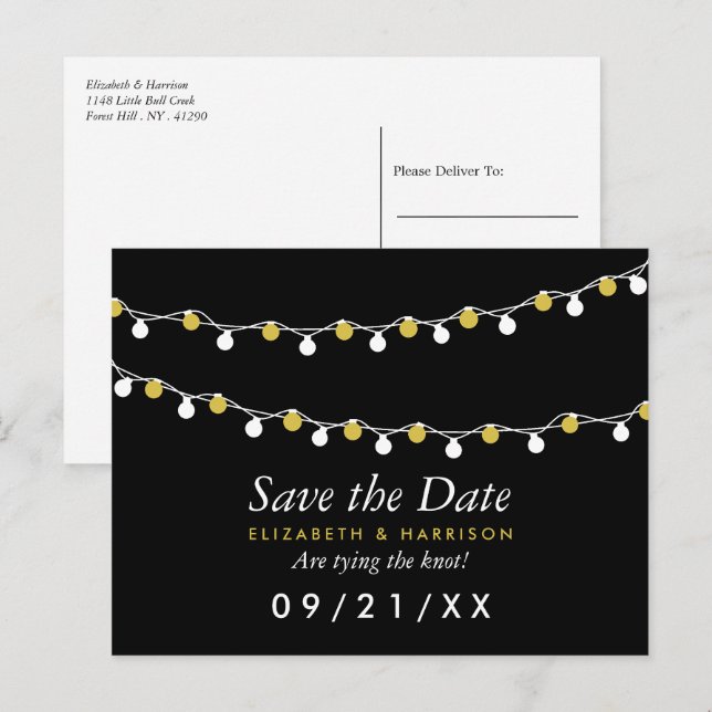 Modern String Lights, White & Gold Save the Date Announcement Postcard