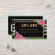 Modern elegant classy black and mint green stripes with golden border cute watercolor pink flowers and back side QR code discount business card on mint green background. You can easily change all details, fonts, colour, size and background colour,front and back both sides. Replace your own QR code to your website on social media account.