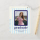 Celebrate in style with our chic and modern graduation party invitation! Featuring playful light blue and white stripes as the backdrop, this design is adorned with bold blue text for a vibrant and contemporary flair. Perfectly tailored to showcase a cherished photo, it’s a sophisticated way to invite loved ones to join the celebration.