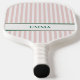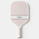 Modern Stripes Pink and Green Personalised Name Pickleball Paddle features soft pink and white vertical stripes with a bold green name centred on a white band for a modern, elegant look. Perfect birthday gift for her. A chic and useful pickleball paddle that’s both stylish and personal.