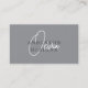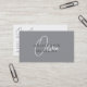 This sophisticated and stylish business card design features a modern grey and white colour scheme with an elegant mix of serif and script typography. The front showcases a distinctive overlapping text layout, where the bold uppercase business name is complemented by a flowing handwritten accent, creating a refined and artistic look. The back maintains a clean and professional design with essential contact details, a QR code for instant digital access, and social media icons for a contemporary touch. Perfect for entrepreneurs, designers, and creative professionals, this customisable design exudes elegance and professionalism while making a lasting impression.