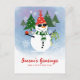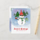 Send a cheerful note with this holiday postcard featuring the snowman surrounded by decorated pine trees and falling snow. His red Santa hat and green scarf pop against the cool-toned background, while the editable message lets you personalise your seasonal greeting.