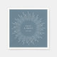 Modern light blue sunburst frame, slate blue personalised paper napkins. Template provides two spaces for names and event date.