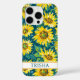 Customize this colorful modern sunflowers on teal painting iPhone 16 pro case with your your name in a trendy modern CAP font in teal on white. It's so beautiful and happy!